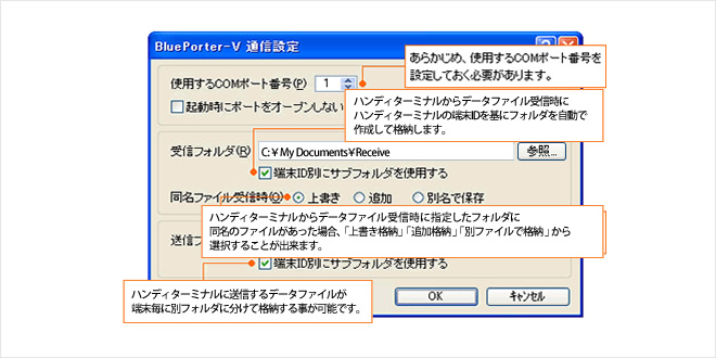 BluePorter-Vは、ハンディターミナルとパソコン間のファイルの送受信を行う転送ユーティリティです。パソコンにインストールして簡単な設定を行い、USBに接続する別売通信ユニット(IU-004C)を経由してファイルの送受信を簡単に行うことができます。