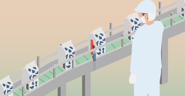 紙パック飲料の充填工程で充填機にセットされた紙パックに、正規のパックと異なる製品のパックが混入した場合、パックと中身が異なる製品が生産されてしまう恐れがあります。充填後の検査工程でパッケージに印刷されているJANコードをレーザスキャナや2次元コードリーダで読み取り、異品種混入を防止します。パッケージ検査は一般的にスキャナを使用して、パッケージに印刷されたJANコードを読み取り、登録データとの一致、不一致を照合する作業です。